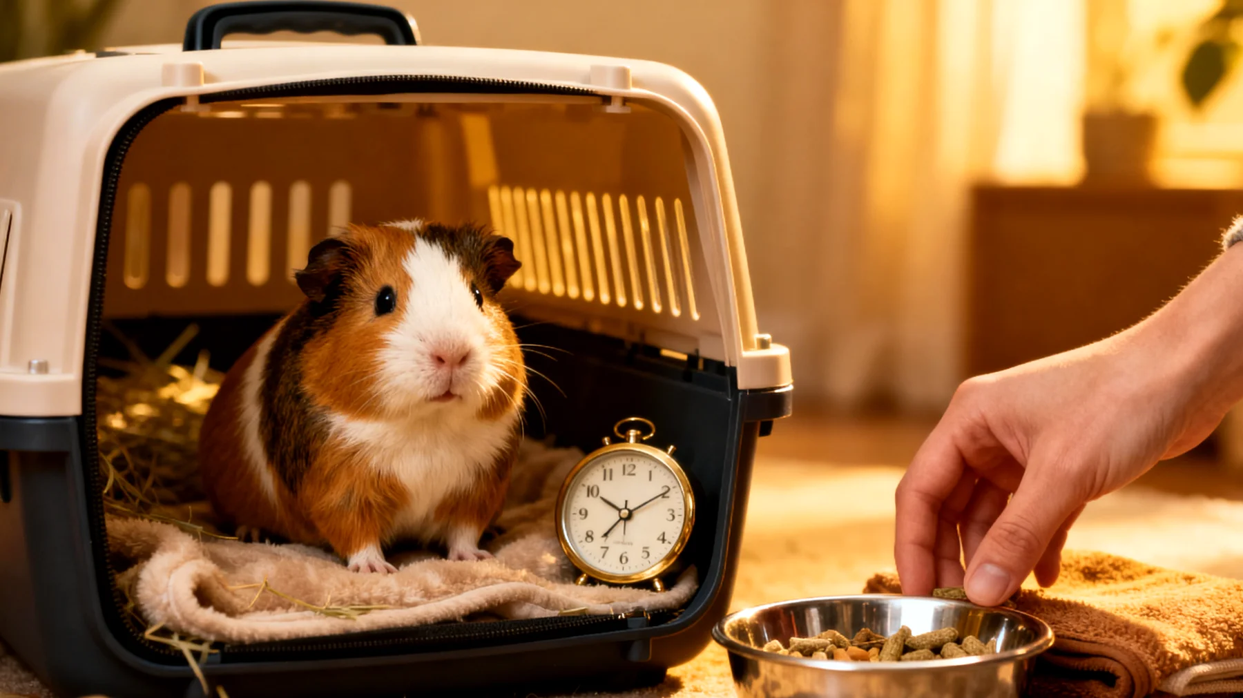 Nach der Ankunft benötigen Meerschweinchen mindestens einen halben Tag, um sich an neue Gerüche und Geräusche zu gewöhnen. Stellt das Gehege an einem ruhigen Ort auf und behaltet die Fütterungszeiten exakt bei – selbst wenn das bedeutet, um 7 Uhr morgens aufzustehen.